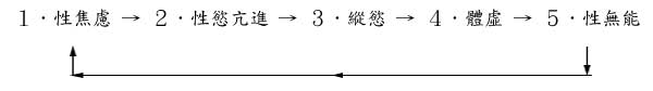 据诺伊(P.NOY)表示,由性焦虑所表现出的性无能,其前兆就是「性欲亢进」,它的「恶性循寻」如下表: